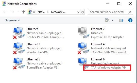 En esa lista de conexiones, habrá una con el término “TAP-Windows Adapter” debajo. Haz clic derecho sobre ella y selecciona “Properties” (propiedades). Haz clic en la pestaña derecha que dice “Sharing” (compartir) y luego haz clic en el cuadro que dice “Allow other network users to connect through this computer’s Internet connection” (permitir a otros usuarios de la red conectarse a través de esta conexión a Internet).